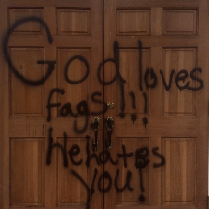 Based on a report by the Christian Post, the Bales Wesleyan Church of Jamestown and Grace Baptist Church of Greensboro, both located in Guilford County, were attacked by as yet unknown perpetrators who sprayed 'Gay's OK' and 'God loves Fags' on the doors and walls of the churches.