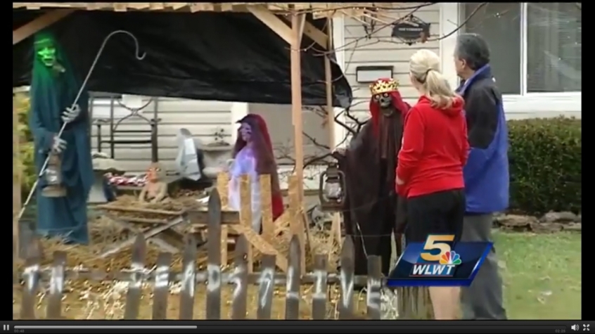 Jasen Dixon's display outside of his Sycamore Township home features zombie statues dressed as Mary, Joseph, and the Three Wise Men, and there is even a zombie baby in a manger.