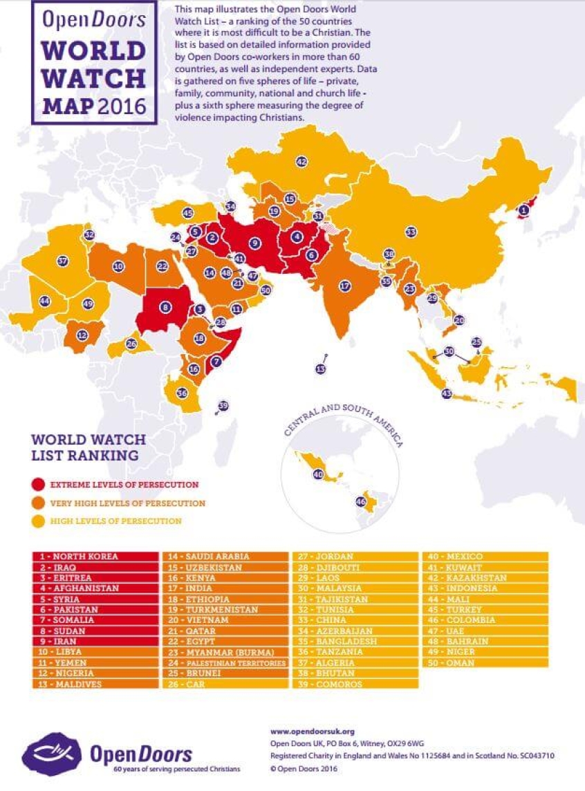 The Open Doors World Watch List uses a variety of indicators to measure how faith gets squeezed in five distinct areas – private life, family life, community life, national life and church life – as well as covering violence such as rapes, killings and church burnings.