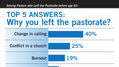 Although forty per cent of pastors said their leaving the role was due to a change in calling, a significant number cited church conflict (25 per cent), burn out (19 per cent), personal finances (12 per cent) and family issues (12 per cent) as the reason they left.