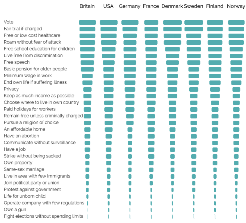 YouGov identified 30 rights, split them into two lists and asked people to choose five from each list. In his blog, YouGov president Peter Kellner points out that the fact panel members didn't vote for a particular right doesn't mean they don't believe in it, it just means they think something else is more important.