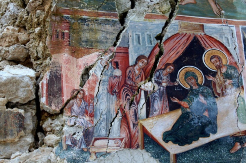 The church has plastic sheets over its walls for protection while debris with parts of frescoes is piled to one side.