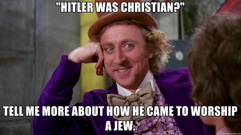 Right. Hitler made some garbled references to God in a few speeches, so he's labelled a Christian, though the words were obviously opportunistic, and the guy deranged. In fact, Goebbels wrote that Hitler "hates Christianity" and "rightly so". The Nazis said that their "Positive Christianity" notion wasn't "dependent upon the Apostle's Creed", nor in "faith in Christ as the son of God" but on the Nazi Party and Hitler himself. In other words, it wasn't Christianity. And finally:
