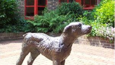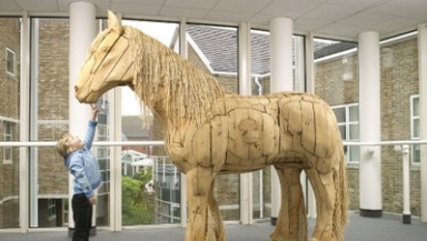 A giant mobile of red and blue pencils sways mesmerizingly in the breeze. A life-sized horse made of recycled timber adorns a corridor. A brass dog gazes up at the sky in a courtyard.
