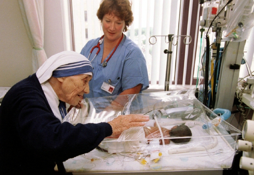 Mother Teresa blesses one week-old Dejen Abreha in the neo-natal intensive care unit at Saint Margaret's Center for Women and Infants, in Boston, June 15, 1995.