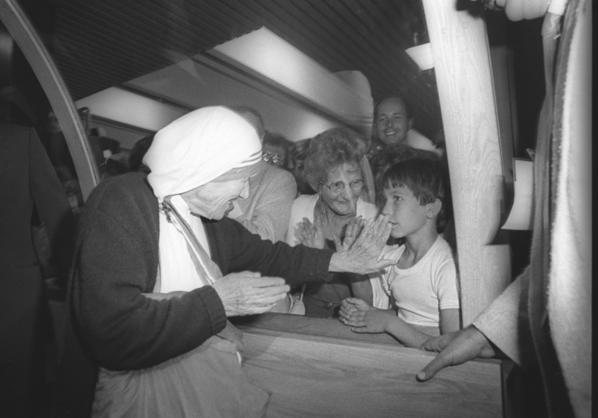 Mother Teresa touches the protective window towards the face of a young child who was among the hundreds who came to greet her at the Quebec Airport, June 10, 1986.