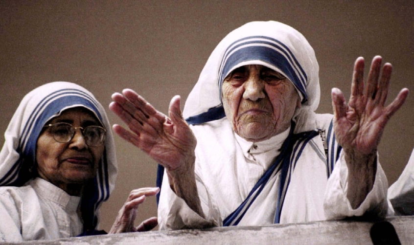 Mother Teresa blesses reporters and photographers gathered in the courtyard of the headquarters of her Missionaries of Charity in the eastern Indian city of Calcutta, March 14, 1997.