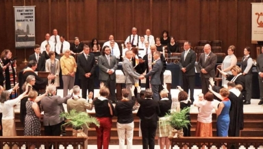 Rev Val Rosenquist married John Romana and Jim Wimborne on April 23, in the first public same-sex wedding in a United Methodist church. She officiated at the wedding with retired Bishop Melvin Talbert, who called their stance a stand against discrimination and an act of "biblical obedience".