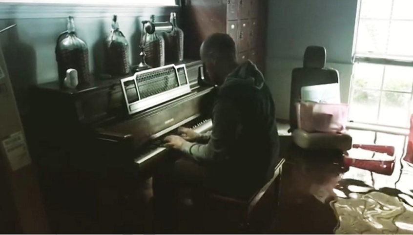 As he was going around his destroyed home, he took a moment to play a gentle tune on his son's piano.
