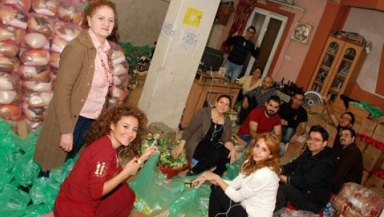 The image shows a group of Christians in Aleppo preparing food parcels to hand out across the city. They are smiling directly at the camera, they're well dressed, the women are listening to music on their phones or ipods; they look like they are having a good time. Other photos of the volunteers in the church show the group fooling around and joking with each other. In one, a woman is posing with a plastic bag on her head and laughing.