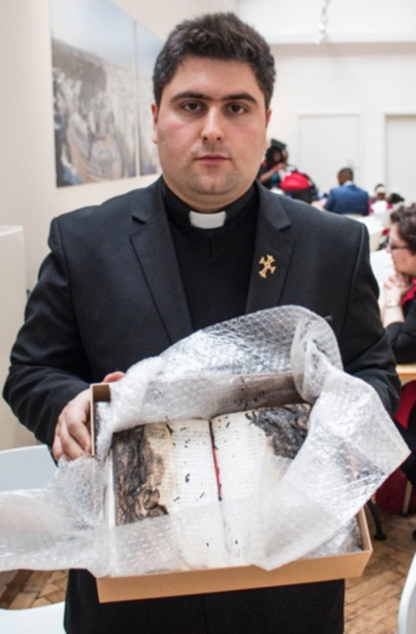 Father Daniel with the Bible burnt by Daesh and presented to Prime Minister Theresa May. Open Doors International