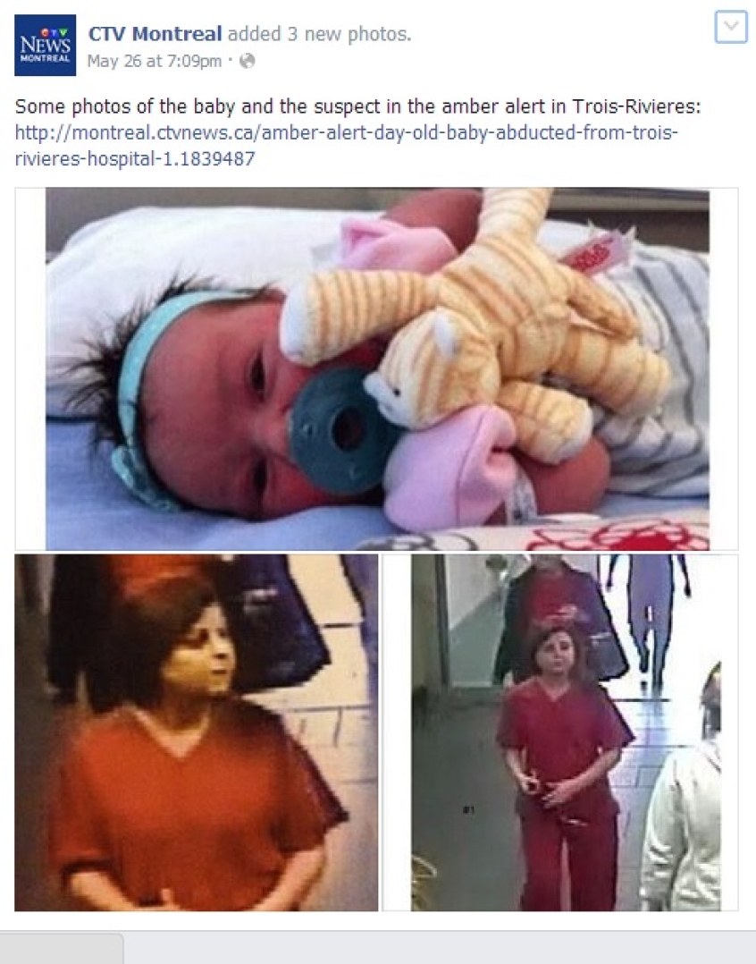 Pictures of the kidnapped baby and the suspect were posted to Facebook from an Amber Alert, and a Quebec woman recognized the suspect as her neighbor. The woman and her friends alerted police to the abductor's location, and remained on the scene until authorities arrived.