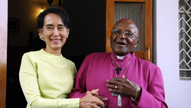 Tutu beamed as he met the fellow Nobel laureate and "total icon" at her home in Rangoon.