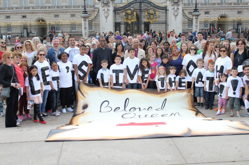 The congregation of young and old rolled out a giant scroll with the words "Beloved Queen". Eight members of the congregation wore T-shirts with letters that together spelled "Let's Live the Oath!!".