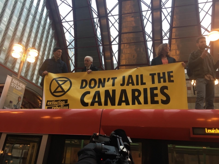 They also held up banners saying "Don't jail the canaries" and "business as usual = death".