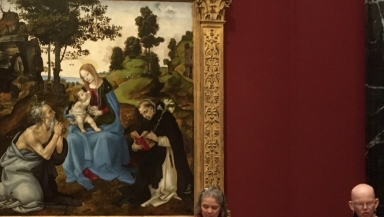 The women stood before a 15th-century painting by Filippino Lippi, portraying the Virgin and Christ Child being worshipped, with an altered poster of the artwork.