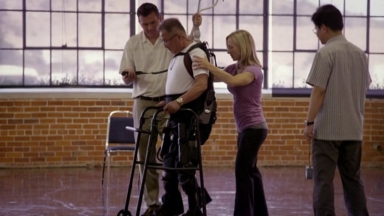 A metal ring is used to secure the Ekso Works suit around the waist. The exoskeleton also features a stripped down backpack and an advanced device where a large swing arm fit into a socket.