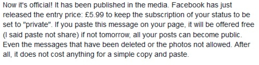 "Now it's official! It has been published in the media. Facebook has just released the entry price: $5.99 to keep the subscription of your status to be set to 'private.' If you paste this message on your page, it will be offered free (paste not share) if not tomorrow, all your posts can become public."