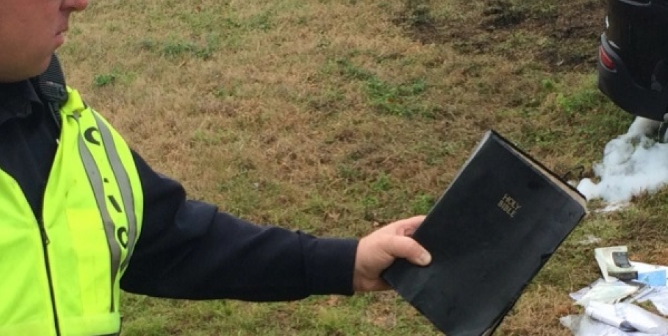 When the flames were extinguished, the police checked what's left of the gutted vehicle. To their utter amazement, they found a copy of the Holy Bible inside.