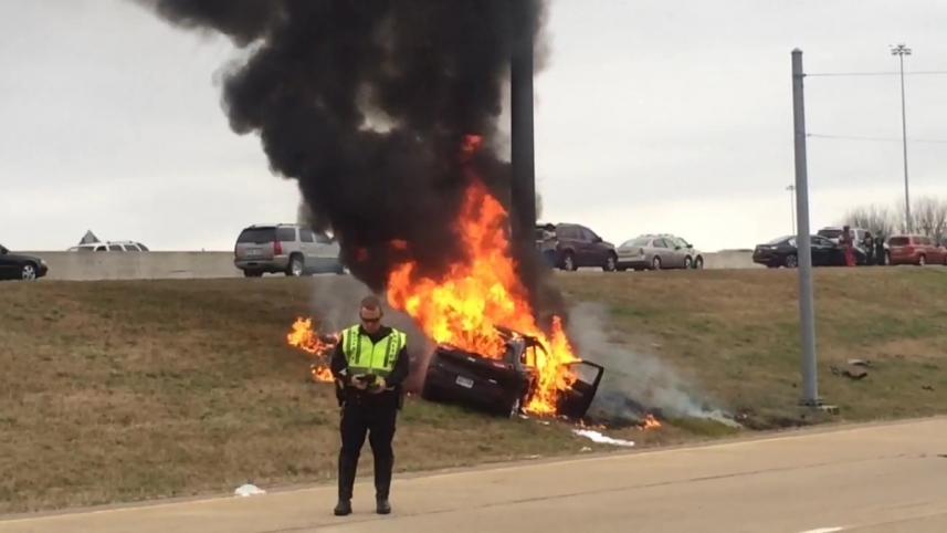 Amazingly, the still unidentified driver of the vehicle was able to get out of the burning wreck with the help of responding police officers and Good Samaritans.
