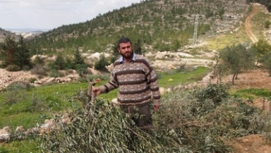In March this year, Raba Fanoun, from the village of Nahhalin near Bethlehem, discovered that settlers had come to his land during the night with hatchets and destroyed 80 mature olive trees, which his father had planted thirty years ago. This was nearly half the total number of his mature olive trees. The livelihood for his extended family depended on them. Later that day, volunteers from the EAPPI Bethlehem team visited Fanoun, to report on this destruction.