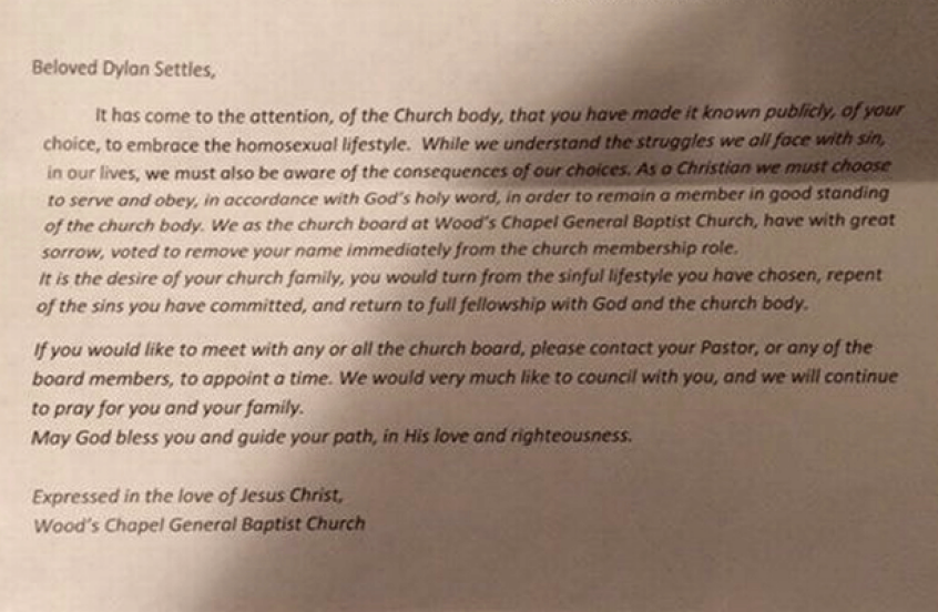 Dylan Settles has published a letter from his church board informing him his name had been removed from the membership list. The note, which has been shared thousands of times on Facebook, urged the 20-year-old to leave his "sinful lifestyle."