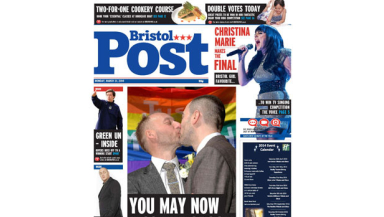 The Bristol Post's March 31 edition showed a large picture of Mike McBeth and Matthew Symonds kissing after becoming the first gay couple in the city to tie the knot after gay marriage became legal in Britain.