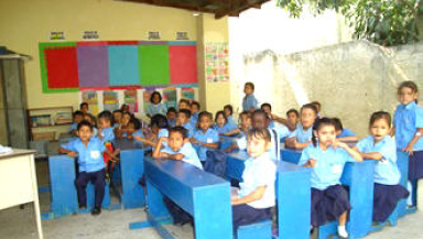 Behind him the school is full of children learning to read and write, do math and operate computers. Signs posted around the treed campus remind students to protect the environment and live according to Christian values.