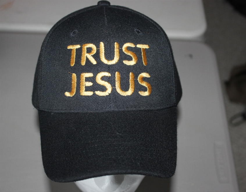 The vanilla of the Christian cap world, there are plenty of straightforward designs carrying a simple message of encouragement. This one tells you to 'Trust Jesus', which must be especially helpful if you meet the wearer in a poorly-lit alleyway.