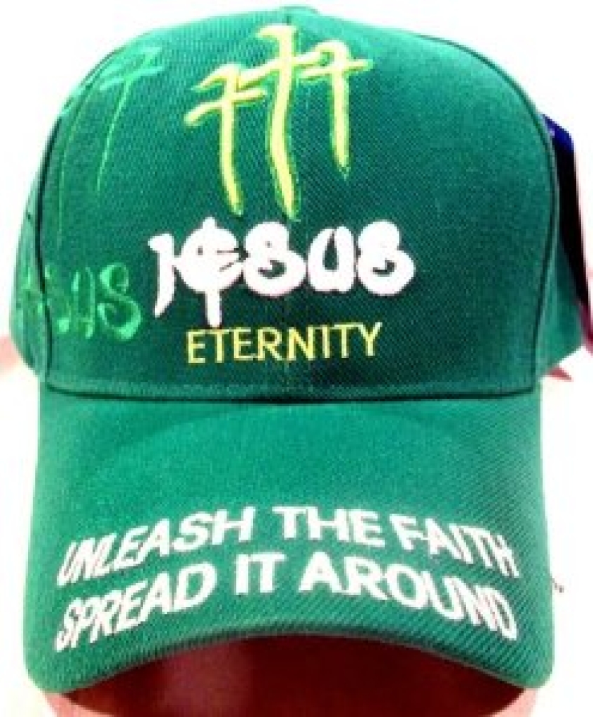 Sometimes a graphic designer just has too many good ideas. That's perhaps what happened in the case of this wonderfully-complex cap, which includes three bent crosses, a call to "unleash the faith, spread it around", the name of Jesus, a random mention of the word "eternity" AND half the design repeated again as a sort of shadow. Any of the above probably would have sufficed; I suppose this is great if you have a lot to say, but can only afford one hat.
