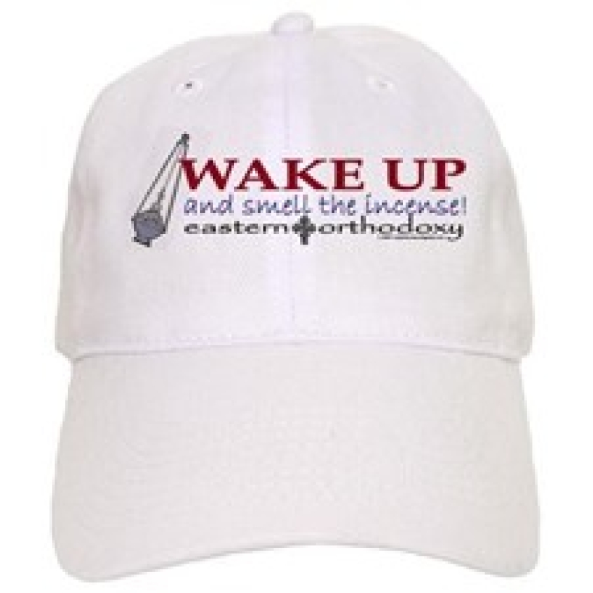 As you might imagine in a world of imperfect church unity, you can buy a hat that pledges your allegiance to virtually any tribe of Christianity. Most are along more territorial lines, like "Proud to be a Baptist", "Methodism: we've got at least 40 years left" and so on. This one is a bit more ambitious, changing the old "wake up and smell the coffee" line to refer to Eastern Orthodoxy and its use of swinging incense. You could be really clever and attach a tiny incense-swinging-thingy to the front, but that might impair visibility.