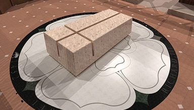 The raised tomb is to be positioned at the centre of a rose carved in white limestone, surrounded by a band of dark Kilkenny limestone.