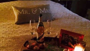Derick prepared a romantic candlelight evening with some drinks, sweets, and Bible study. On his Instagram account (@derickdillard), he posted the photo with the caption, "Happy Valentine's Day from the Dillards!"