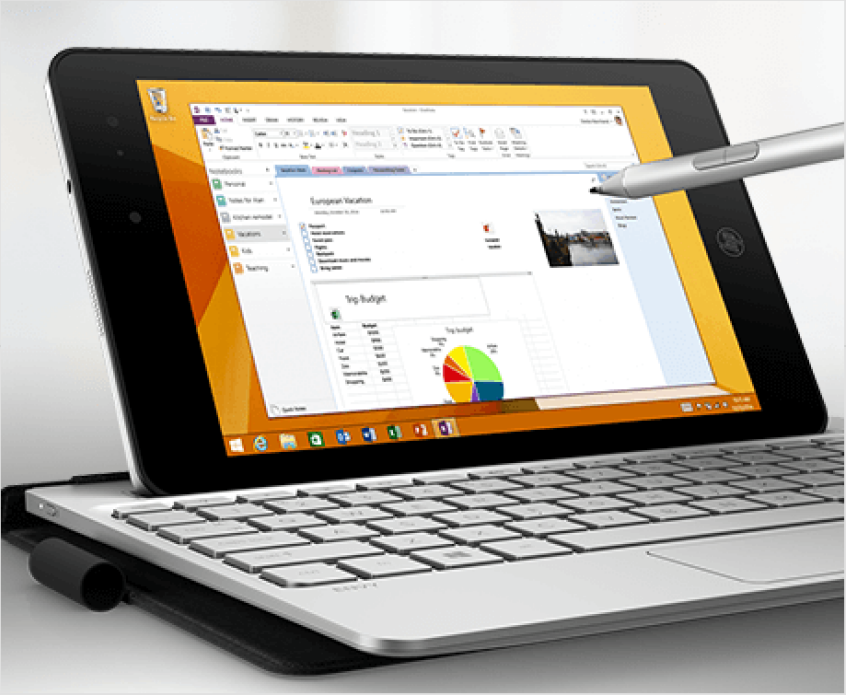 HP Envy 8 Note, the newest Windows 10 tablet, has an 8-inch screen, weighs 0.8 pounds, and is sleek at 7.7 millimeters. It is available with a 10-inch aluminum Note Keyboard Folio, a Bluetooth accessory that allows owners to use the tablet in landscape or portrait mode. The said keyboard has 1.5 millimeters deep buttons.