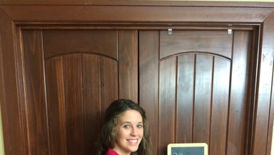 In the photo, Jill is wearing a red long-sleeved shirt and black skirt and holding up a signboard saying "33 Weeks, 4 Days." The photo's caption said, "Getting so very close!"
