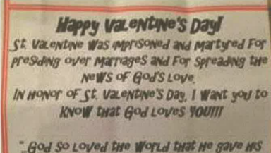 The Abramo's first-grader, who is only identified as "J.A.," attends Floyd Shafer Elementary School, a public school in Nazareth, Pennsylvania. The school refers to Valentine's Day as "Friendship Day" in order to be more politically correct, the lawsuit states. J.A. brought store-bought Valentine's Day cards to school, but included a type-written note with each card.