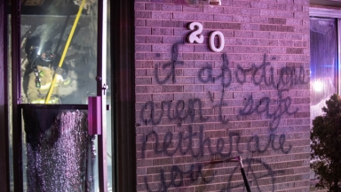 Photos shared by Longmont Public Safety show the building graffitied with the message "if abortions aren't safe neither are you" and "Bans off our bodies" scrawled on the paving outside.