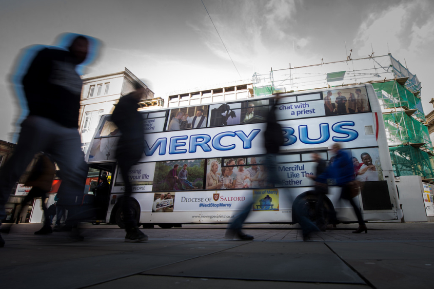 The Mercy Bus – emblazoned with the Year of Mercy Logo – has been in Manchester city centre, or one of the surrounding towns, each Saturday of Lent to offer blessings, conversation and confession to lapsed Catholics and the unchurched.