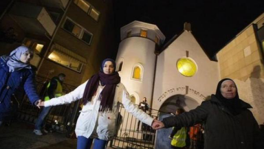 A gathering of Muslims and Jews joined hands around a synagogue in Oslo on Saturday in a display of solidarity between the faiths.