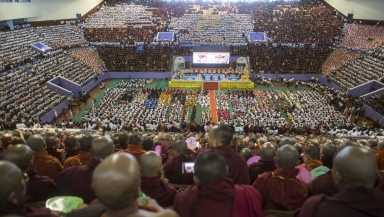 Thousands of devotees in white t-shirts with the Ma Ba Tha logo, monks in burgundy and nuns in pink robes crowded in front of the stage at a sports hall in Myanmar's commercial capital of Yangon. Hundreds of buses and trucks lined the streets leading to the site.