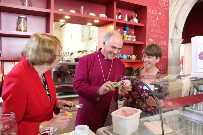 The Bishop of Sherborne swapped his bishop's staff for an ice cream scoop this month when he dished out the delicious frozen stuff for the opening of a 14th century church's new ice-cream parlour and youth hub.
