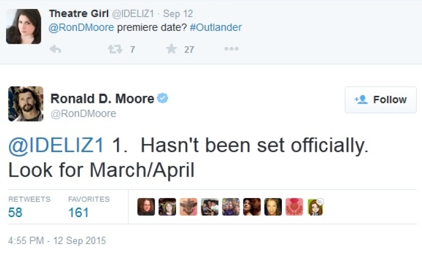 One "Outlander" fan straight up asked the question of the premiere date and Moore responded that while there's no set date yet, viewers should look forward to March or April 2016.