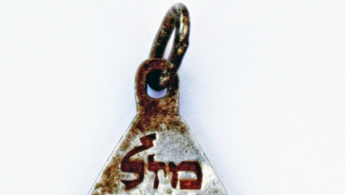 Also found was a unique pendant, probably belonging to a child from Frankfurt who was born on July 3, 1929, which bears the words "Mazal Tov" written in Hebrew on one side and on the other side the Hebrew letter "ה" (God's name) as well as three Stars of David.