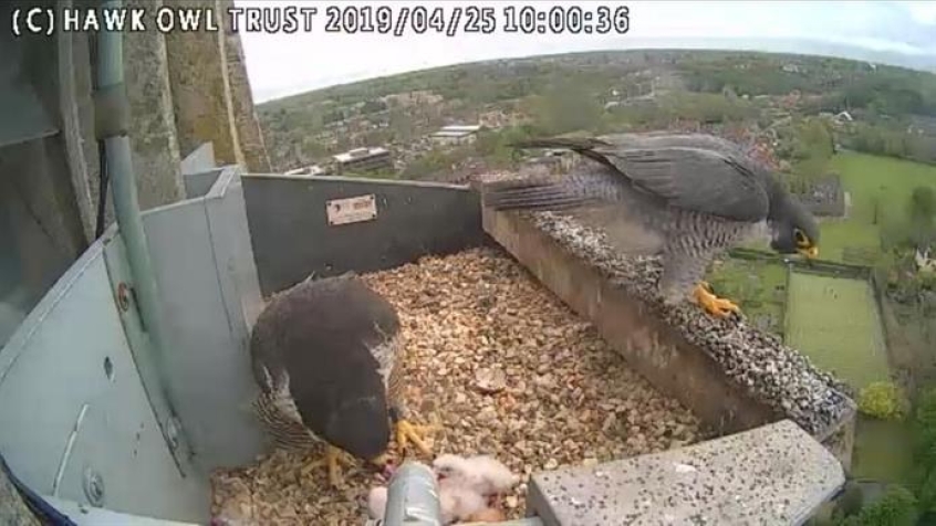 The family of peregrine falcons is nesting on a special platform provided by the Hawk and Owl Trust, which works to conserve Britain's birds of prey.