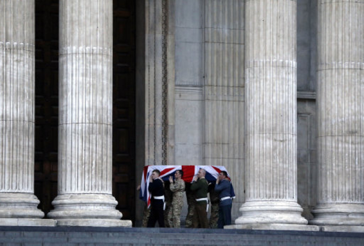 British forces' officers carry a Union Jack-draped coffin outside St Paul's Cathedral in central London early Monday, April 15, 2013 during the rehearsal for the upcoming funeral of former British Prime Minister Margaret Thatcher