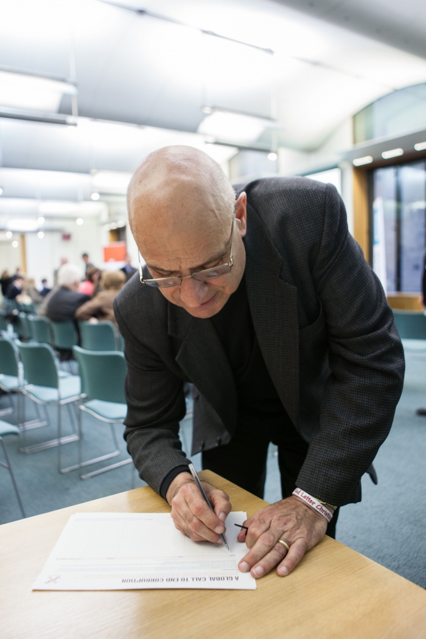 Tony Campolo addressed parliamentarians in Westminster on Wednesday about the need to eradicate corruption. The event was organised by Bible Society as part of the church-led Exposed campaign encouraging people to sign a Global Call to End Corruption. The campaign will culminate with a weeklong vigil from 14 to 20 October, with Christians around the world participating. Exposed campaigners are aiming to get a million signatures added to the petition, which will be presented to G20 leaders at a summit in November 2014. Campolo demonstrated his support by adding his signature at Wednesday's event.