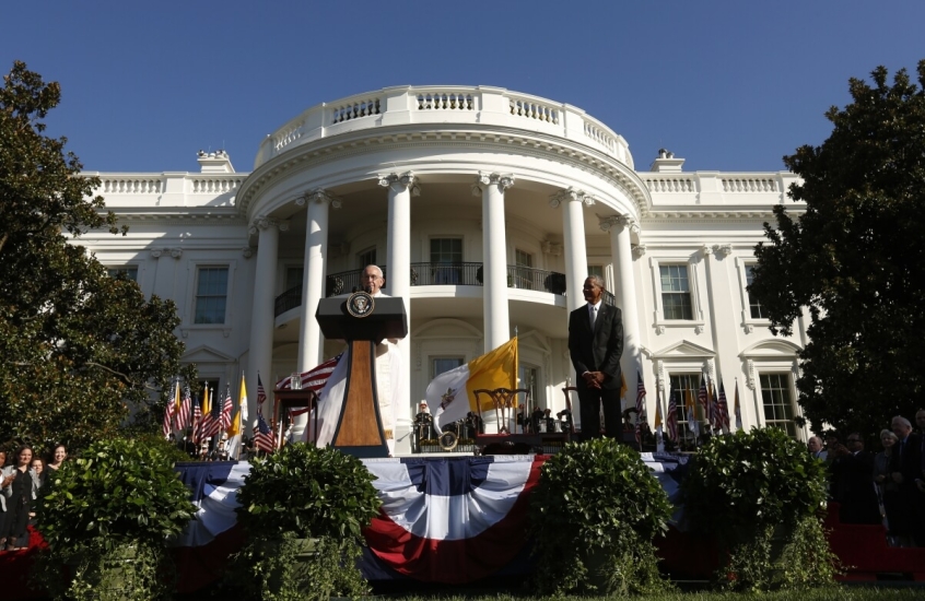 Prompting cheers from the crowd, he said the United States was a country built on immigration, and that he too had been an immigrant. He also spoke about the importance of facing up to climate change and added that during his six-day visit he will be talking about marriage and family life.