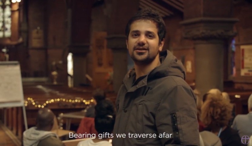 In the video, members of the congregation take turns in speaking lines from the popular carol, We Three Kings, with one line being spoken in the Farsi language by Michael, an asylum seeker who fled his native Iran.