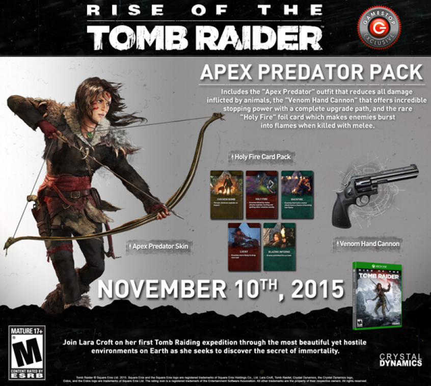 Based on the announcement posted on GameStop's official Facebook page, one of the bonus items that players will receive after pre-ordering "Rise of the Tomb Raider" is the Apex Predator Pack. This will include several items such as the Apex Predator Outfit, a patchwork garment made from metals, furs, and different scraps of cloth. The outfit is allegedly designed to lessen the injury that Lara can acquire during her encounter with dangerous animals.