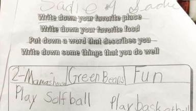 Lastly, Sadie listed down her favorite place - 'Mama's house' - favourite food - green beans - and the word that best describes her - 'fun'. After, she was asked to write down the things she does well, and Sadie wrote: play softball, basketball, running, swimming, dancing, math, and Bible.